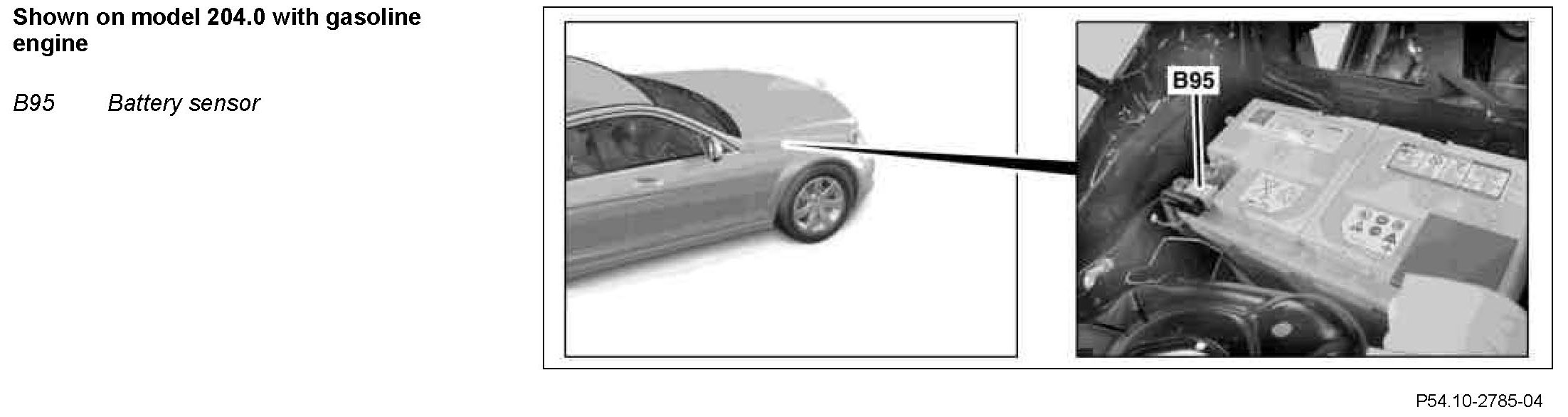 The battery sensor and on-board electrical system battery on vehicles with a gasoline engine are located in the engine compartment, on vehicles with a diesel engine in the trunk.