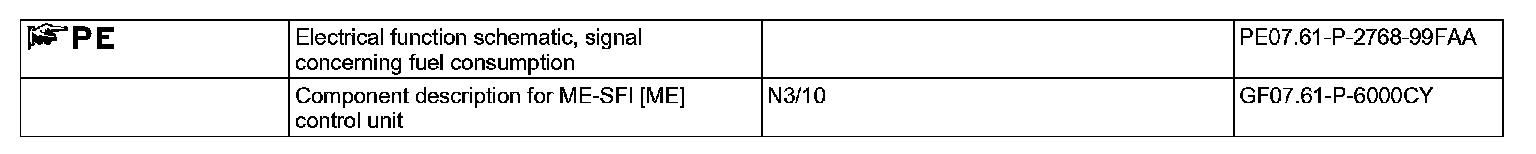 The trip computer in the instrument cluster (A1) is informed via the chassis CAN (CAN E) by the ME-SFI [ME] control unit (N3/10) about the current fuel consumption by means of rectangular impulse packages.