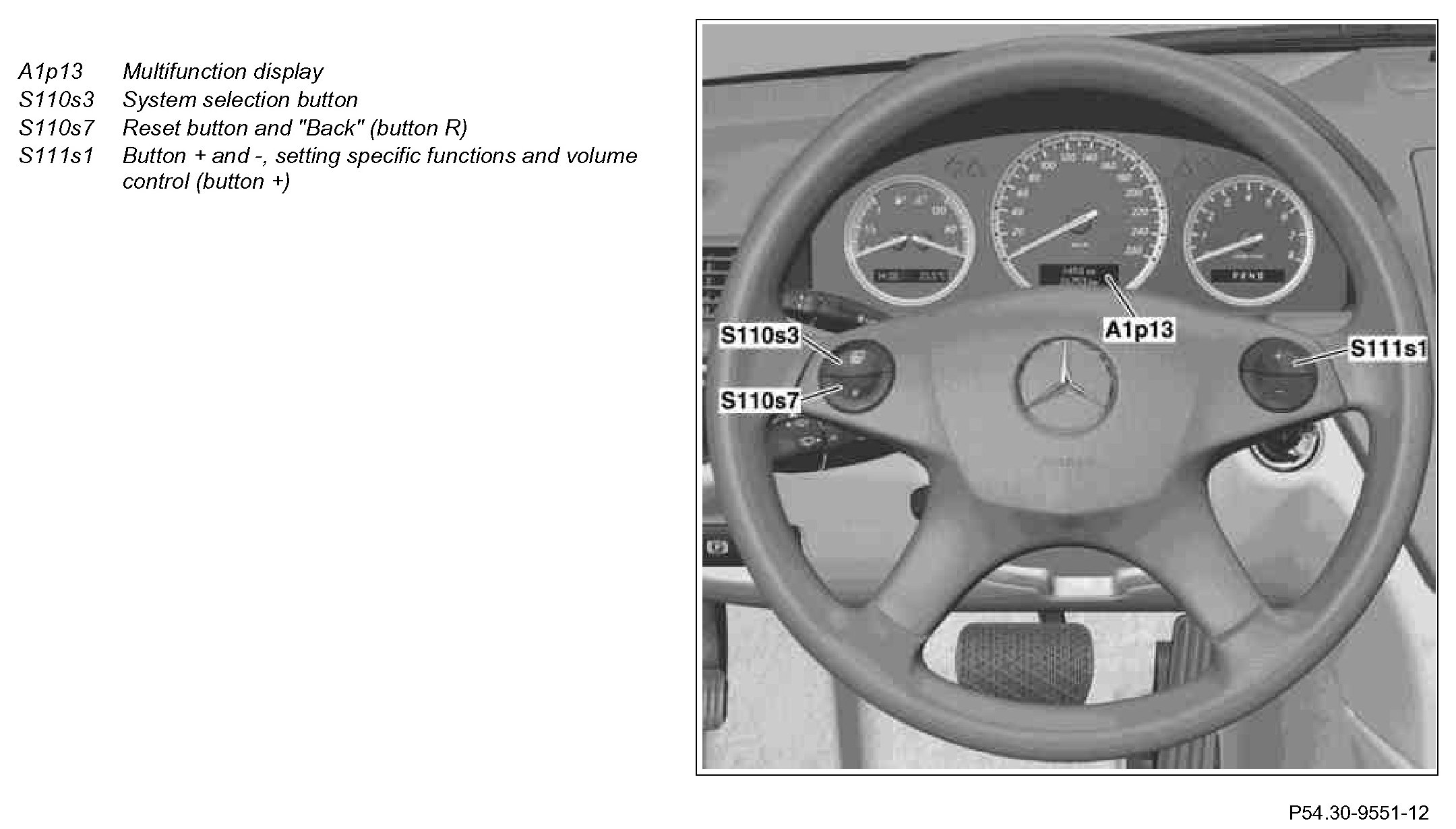 Keep both buttons (S110s7, S111s1) pressed for approx. 5 seconds: The voltage indicator appears in the multifunction display (A1p13).
