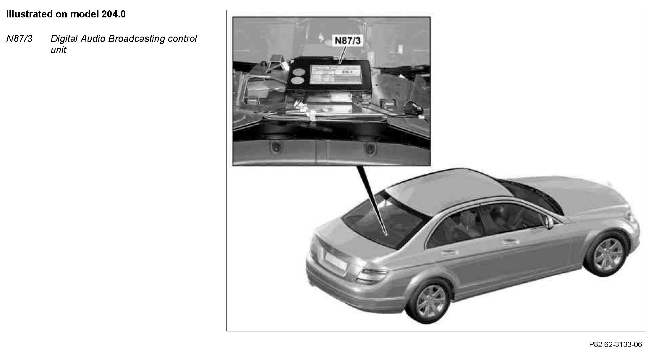 The Digital Audio Broadcasting control unit is located in the trunk under the trunk mat on the crossmember (model 204.0) or centrally on the equipment bridge in front of the spare tire well (model 204.2).