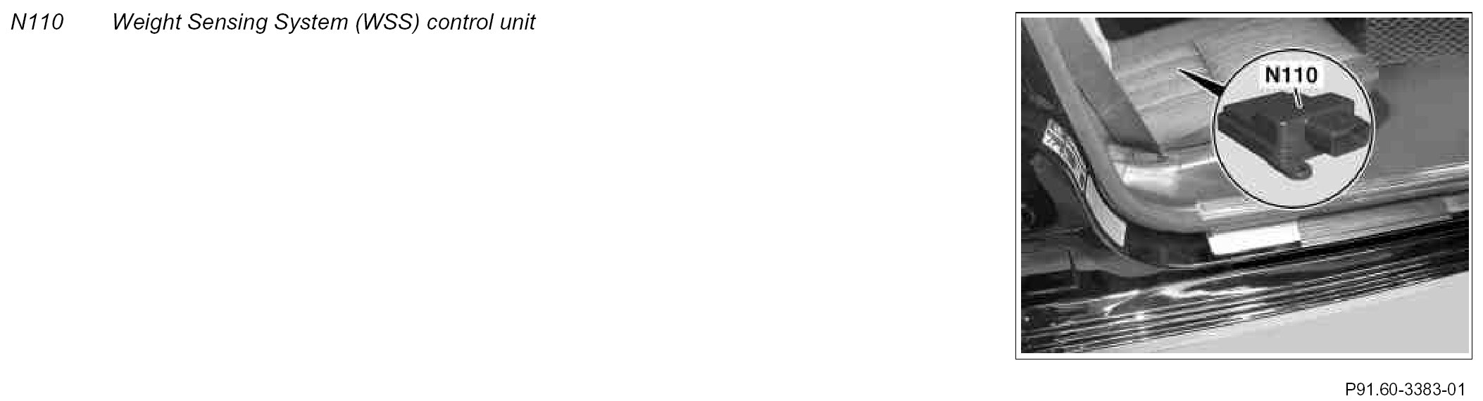 The Weight Sensing System (WSS) control unit uses the pressure and the seat belt tension to calculate the corresponding weight class and forwards this information via interior CAN to the supplemental restraint system control unit (N2/10).