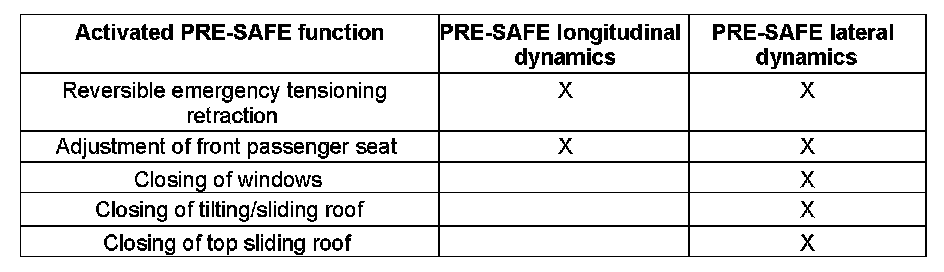 PRE-SAFE is activated in the event of critical drive situations, in other words in a potential accident situation. The goal is to create the most favorable conditions possible for the occupants during the expected accident by activating the functions before the actual impact.