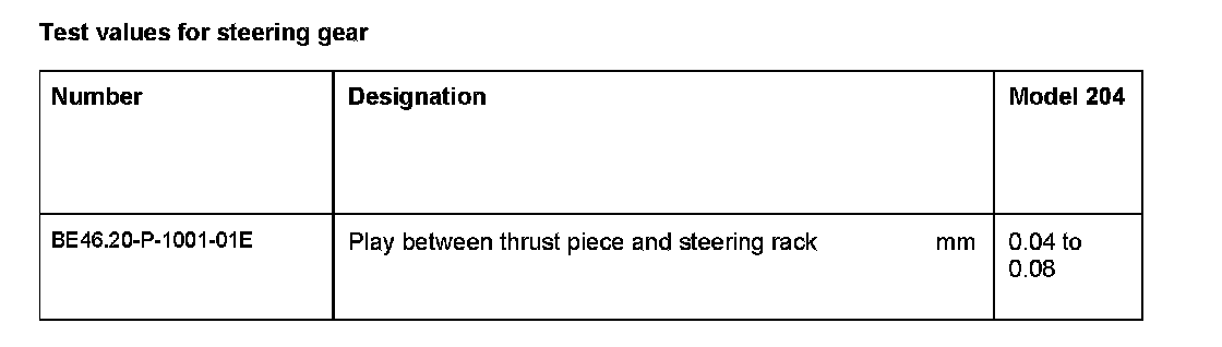 Test values for steering gear: