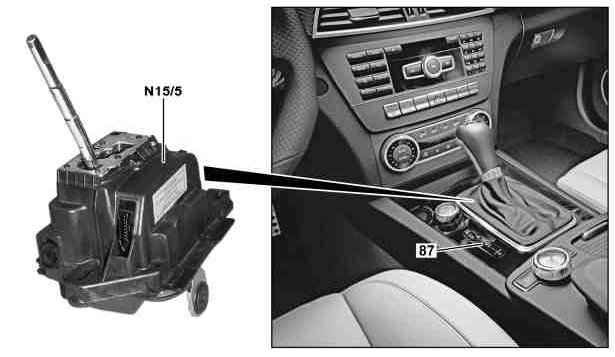 The electronic selector lever module control unit is located under the center console between the two front seats.