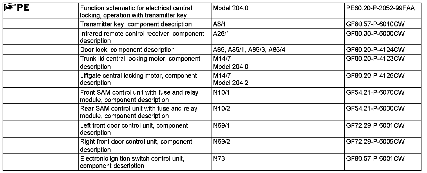When the "Lock or unlock" buttons on the transmitter key are actuated, it transmits a radio signal with the FM, AM and CL antenna amplifier (A2/18) (on model 204.0) or rear window antenna amplifier 1 (A2/71) (on model 204.2) to the rear SAM control unit with fuse and relay module (N10/2). This relays the signal to the electronic ignition switch control unit (N73) with interior CAN.