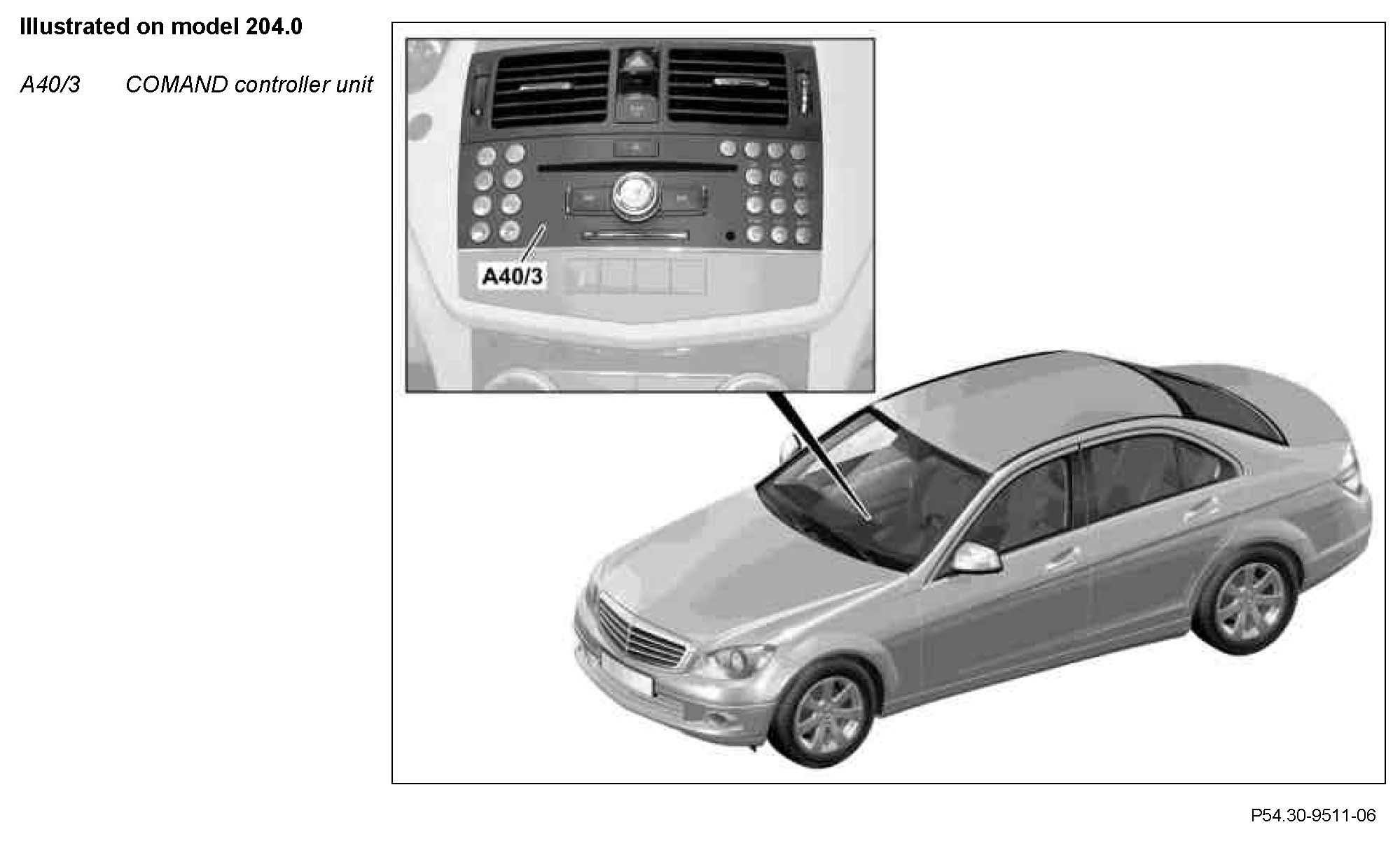 The navigation processor is integrated into the COMAND controller unit. As of an active COMAND controller unit, the navigation system compares the GPS data received by the multifunction antenna (A28/11) against the data for the vehicle position and alignment, and against map data. This determines the position of the vehicle. This is then shown on a map on the Audio/COMAND display.