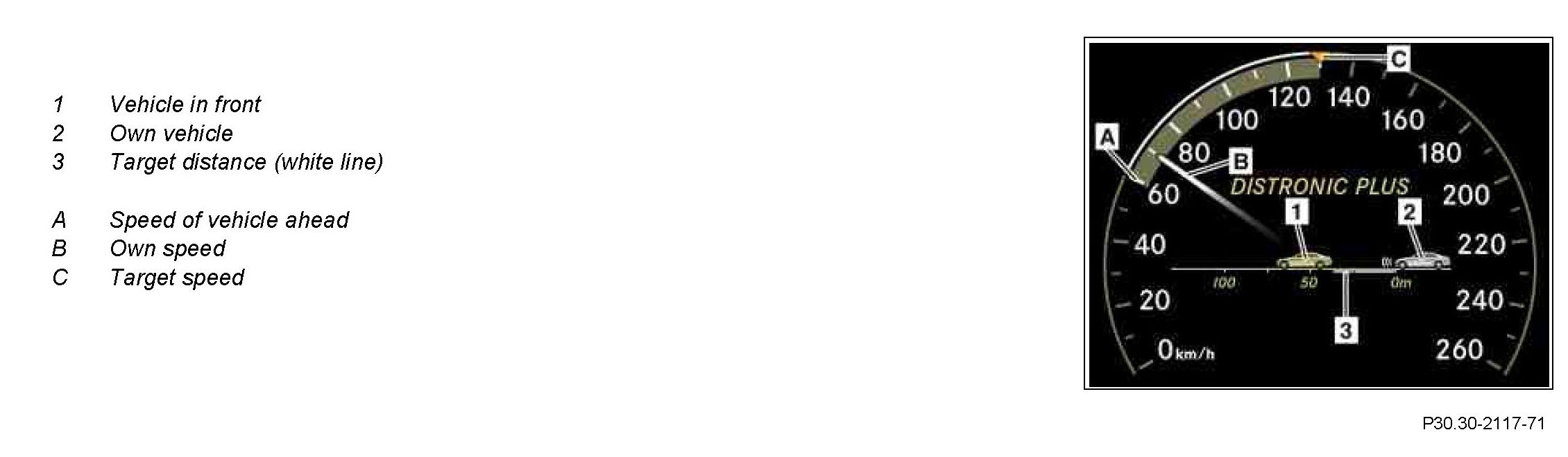 ^ If the driver accelerates on his own initiative faster than the acceleration defined by DISTRONIC PLUS, then DISTRONIC PLUS does not shut down, but changes to the passive state. In the multifunction display of the instrument cluster, the message "DISTRONIC PLUS passive" appears and distance control from the vehicle ahead does not take place for this acceleration procedure.
