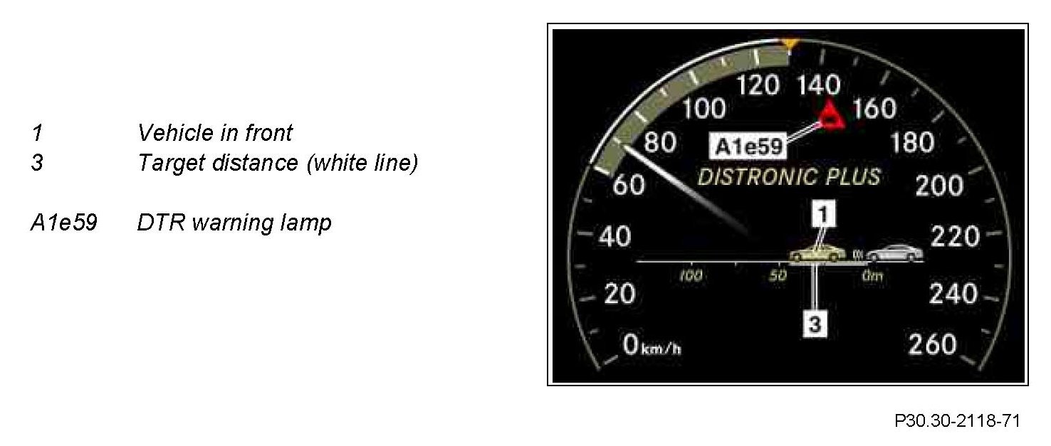 Intervention by the brake system is restricted to 40% (approx. 4 m/s 2 ) of the maximum possible deceleration capacity for reasons of safety and comfort. Driving situations requiring more than 40 % braking power are indicated to the driver visually by the DTR warning lamp (A1e59) in the instrument cluster and acoustically by a tone. This tone is an intermittent chime which advises the driver to observe the traffic situation and intervene if necessary (take over control). The tone is shut off automatically when the situation becomes less critical; it cannot be deactivated manually.