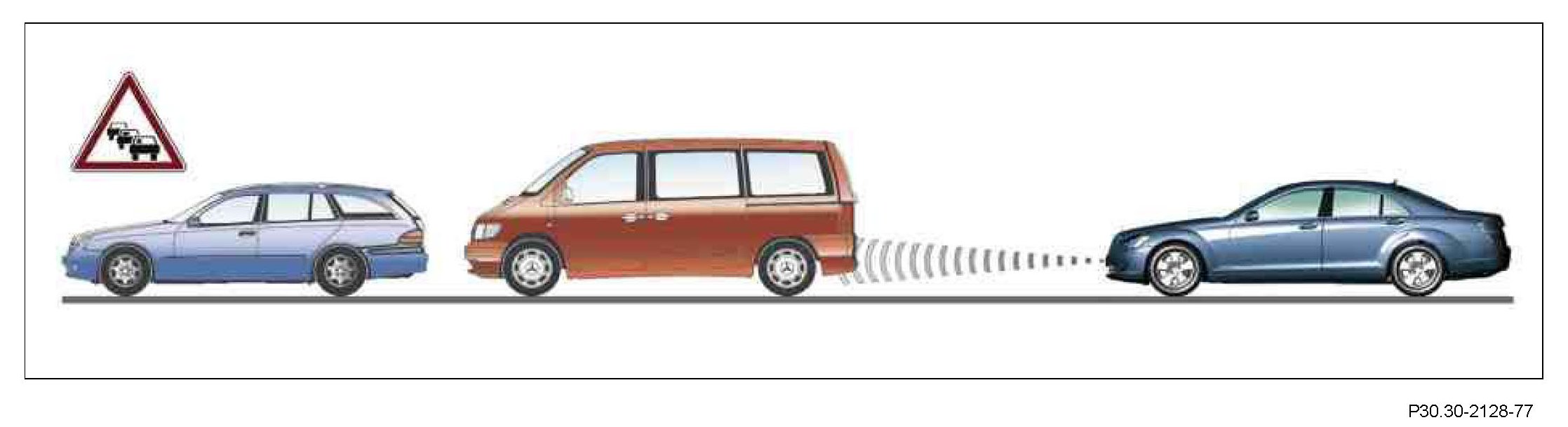 ^ If the preceding vehicle turns off and there is another vehicle in front, the system only switches over to the new target vehicle if it is moving. In the event that a stationary obstruction is encountered, an intermittent takeover tone and the DTR warning lamp warn the driver about the impending collision.