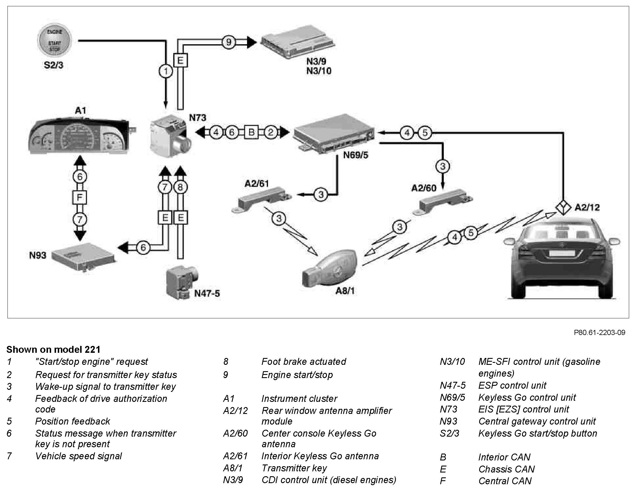 The transmitter key transmits its access authorization code and its position to the rear window antenna amplifier module, which relays it to the Keyless Go control unit; the access authorization code is sent to the EIS control unit via the interior CAN.If valid, circuit 15R and circuit 15 are switched on and the engine is started.