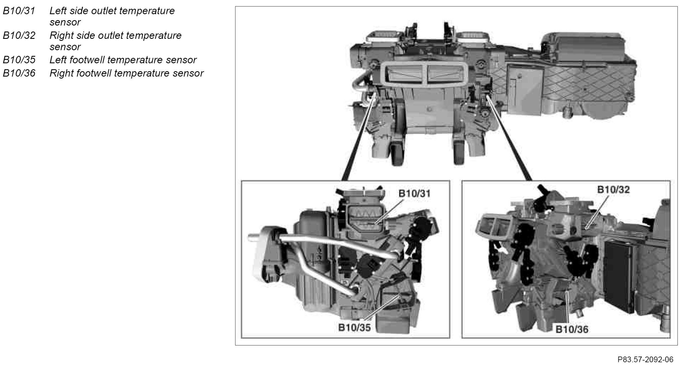 The temperature sensors measure the temperatures of the air flowing out at the respective air flap and forward these values to the AAC [KLA] control unit (N22/1). The measured temperature value of the vent air is compared by the AAC [KLA] control unit with the required temperature. The corresponding blend air flap are adjusted depending on the result. During this measurement, the recirculated interior temperature is also recorded.