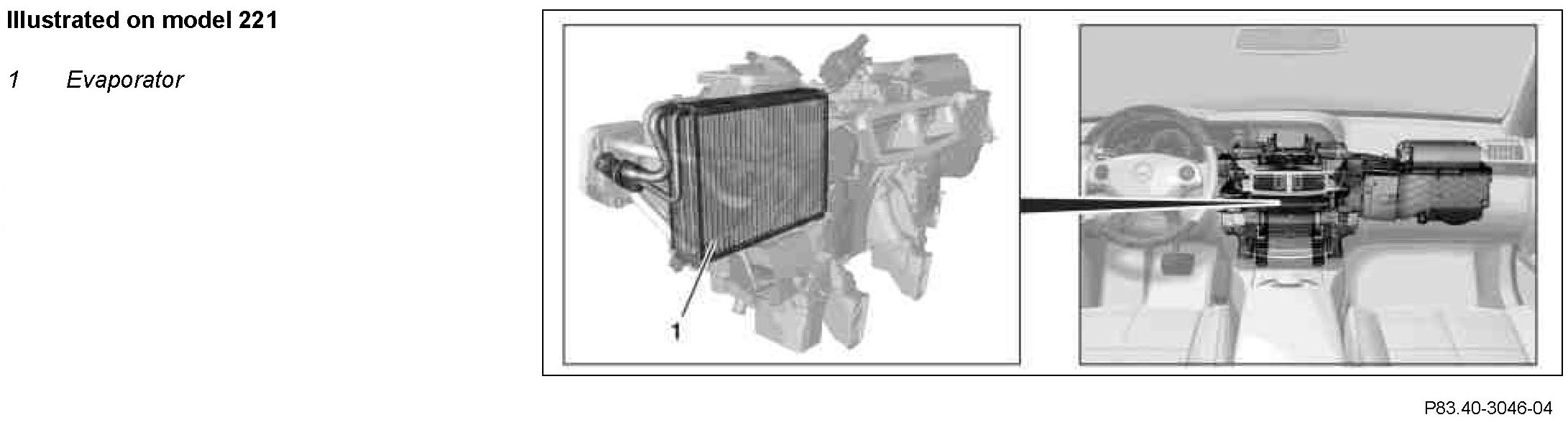 The evaporator is located in the air conditioner housing underneath the instrument panel.