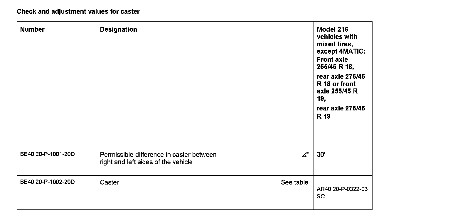 Check and adjustment values for caster: