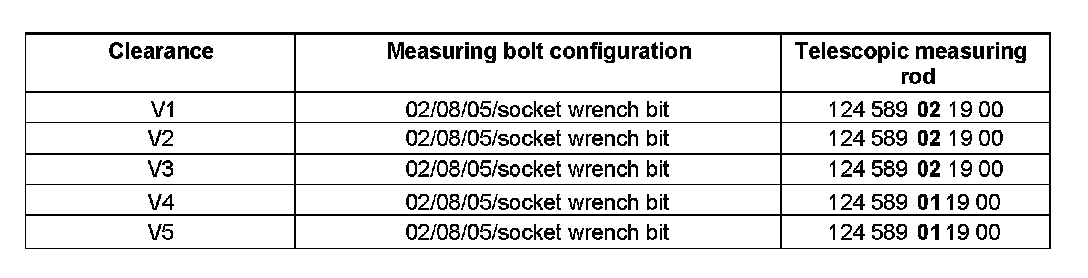 The configuration of the measuring bolts is shown in the table, where the digits in the column headed "Measuring bolt configuration" are the special tool end numbers.