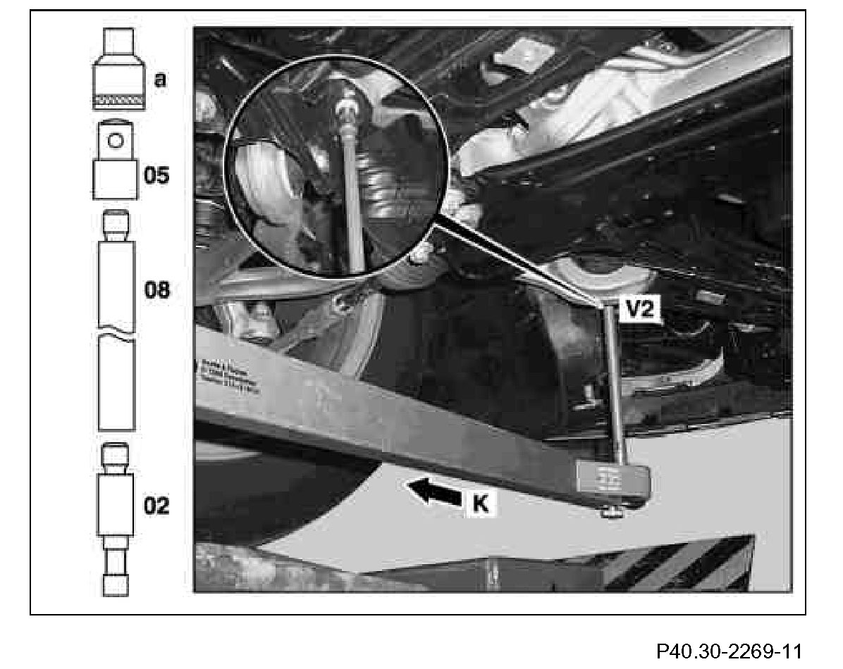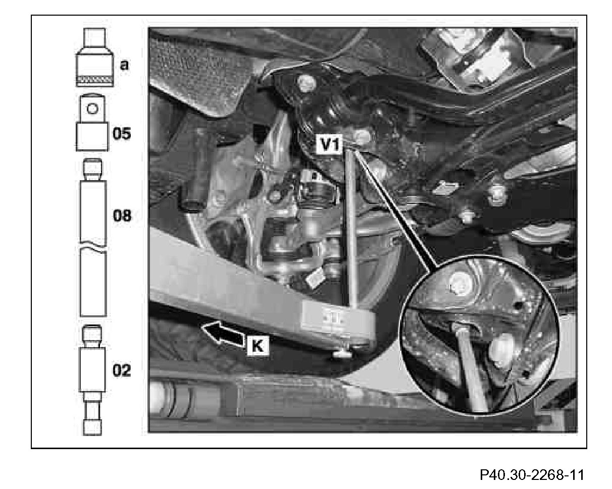 1 Measure distance dimension (V1) from check point (K) to center of Torx(R) bolt head of rear mount of front axle carrier. Measure on the left and right side in each case.