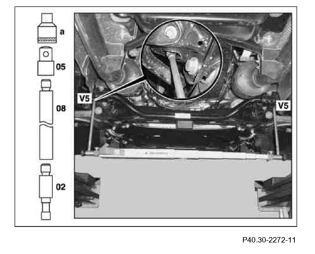 5 Measure distance dimension (V5) from the centering point of the Torx(R) bolt heads between the rear bearings of the front axle carrier.