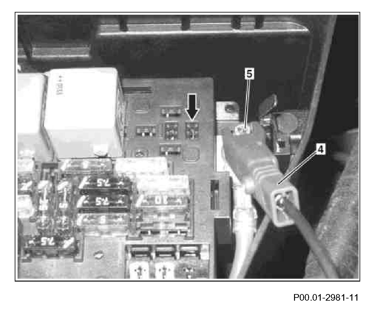 1 Remove cover (1) of left fuse and relay box in the engine compartment.