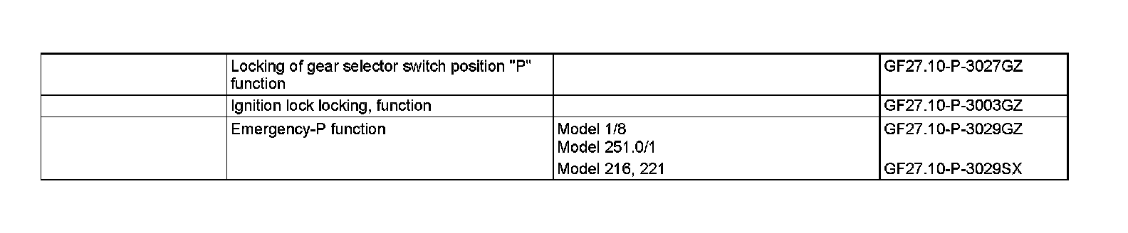 Key-P is used to summarize the functions which serve to prevent the vehicle from inadvertently rolling away in addition the parking brake. These include locking gear selector switch position "P", locking the ignition switch as well as the park pawl in the transmission. The function Key-P only permits switching out of gear selector switch position "P", if the transmitter key (A8/1) has been turned into position "circuit 15 ON" and the brake pedal is pressed.