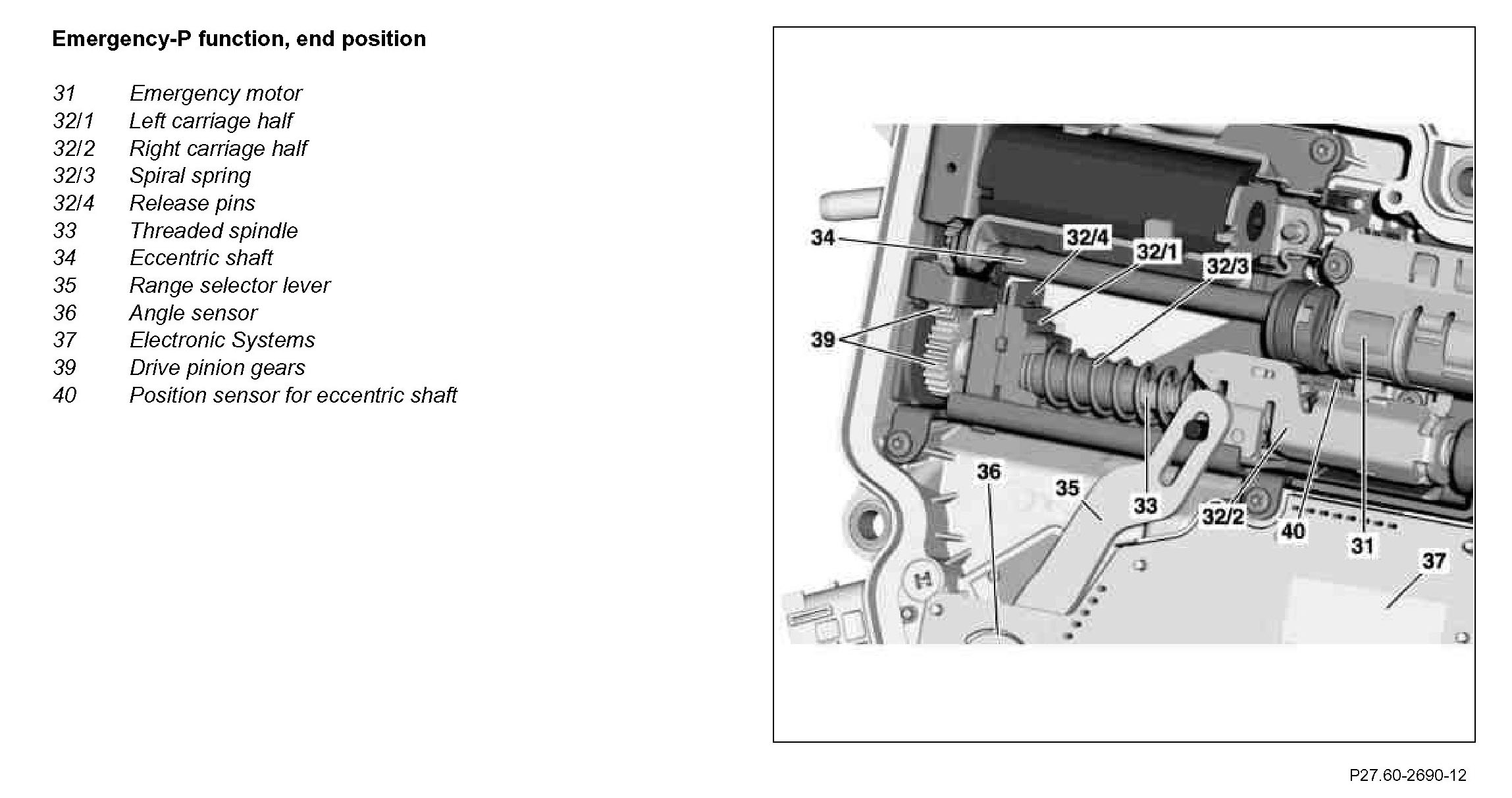The pre-compressed coil spring pushes the two carriage halves apart. The right slider half slides along the threaded spindle to the right and presses the range selector lever into position "P". The eccentric shaft continues to rotate, until the emergency motor is no longer actuated. The actual position of the eccentric shaft is recorded by the positions sensor for the eccentric shaft and sent to the electronic circuit.