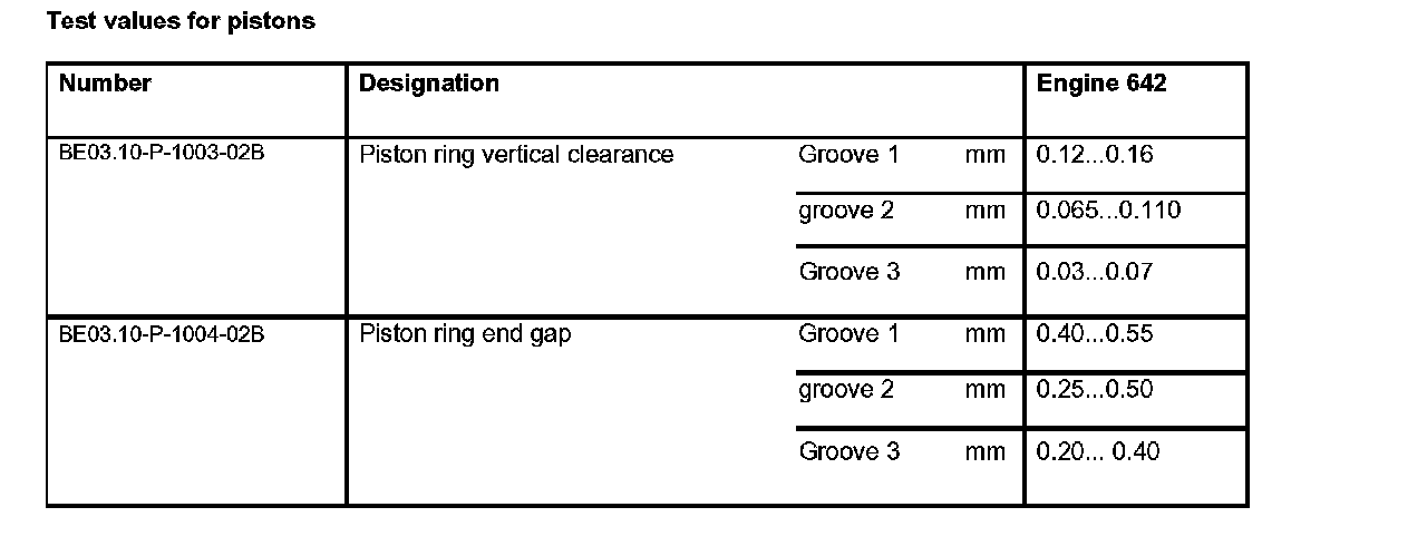 Test values for pistons:
