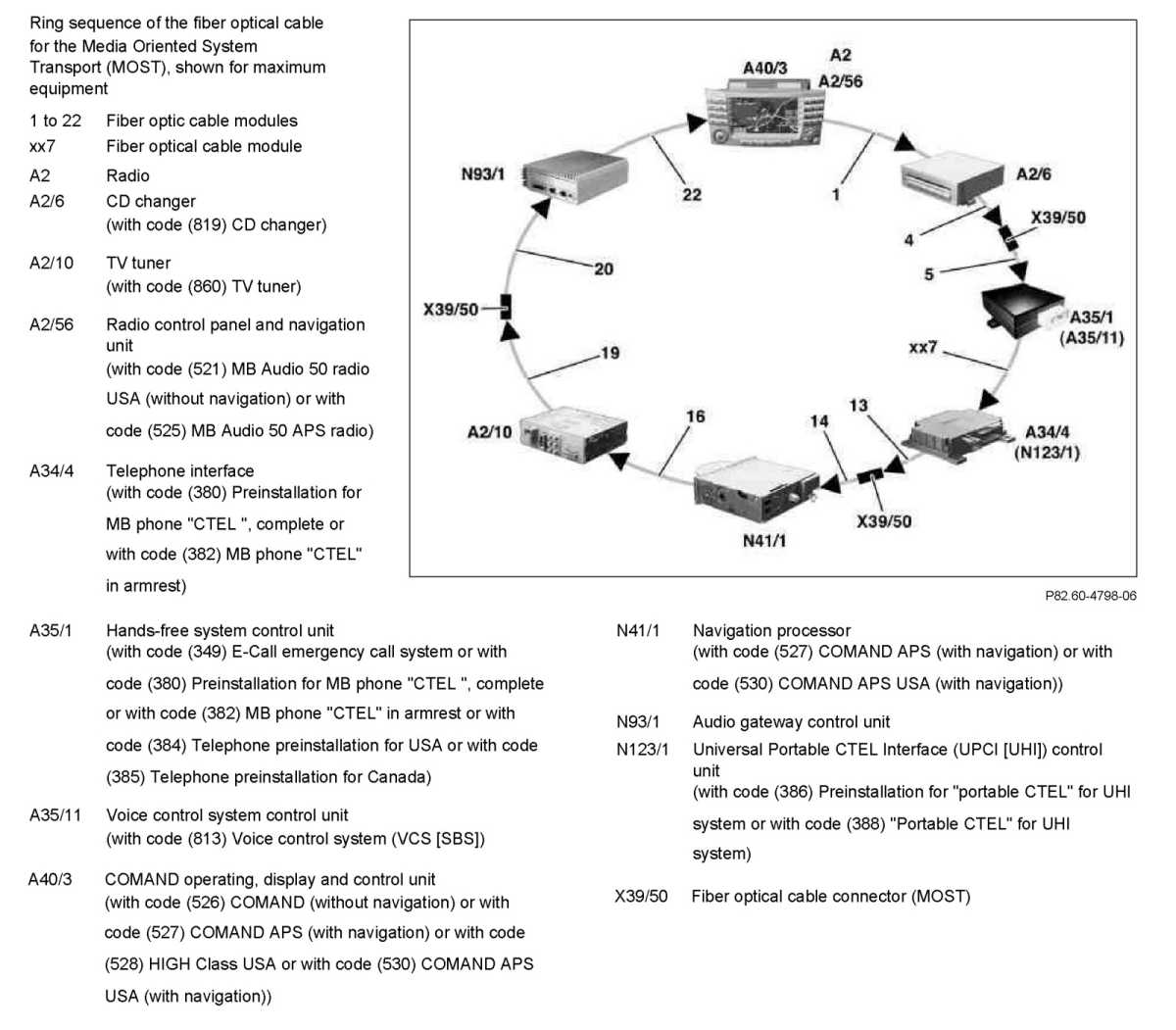 - Fiber optic cable (MOST) between audio gateway control unit and radio/COMAND