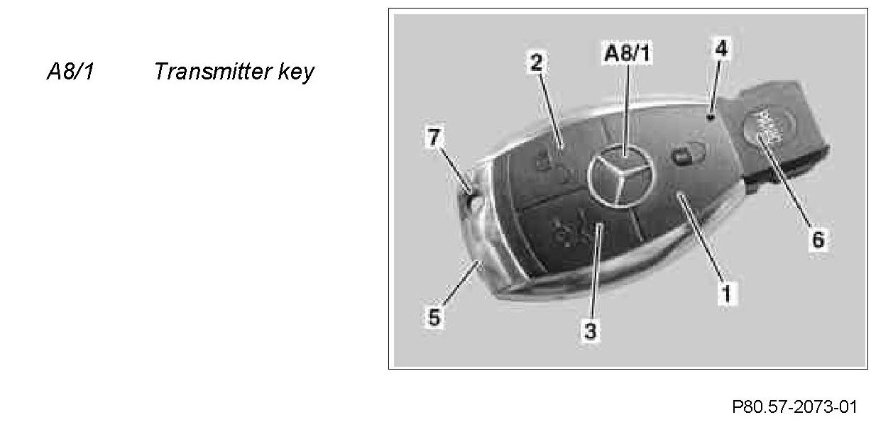 An "electronic key" is integrated in the transmitter key. This key includes an FM radio transmitter, an infrared transmitter/receiver unit, a computer chip as well as two batteries (button cells).Moreover, the following controls and control indicators are integrated: