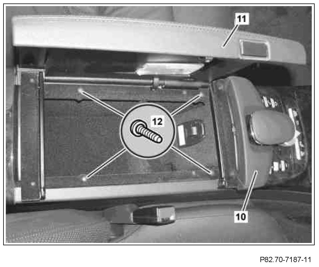 10 Position lid (11) above center console (10) and screw down using screws/bolts (12).