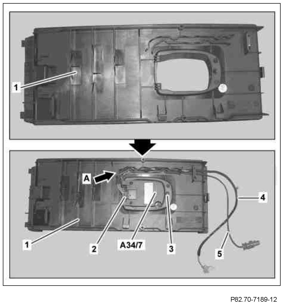 6 Insert paneling (1) with Bluetooth module (A34/7) into stowage compartment in lid (6) and clip in.