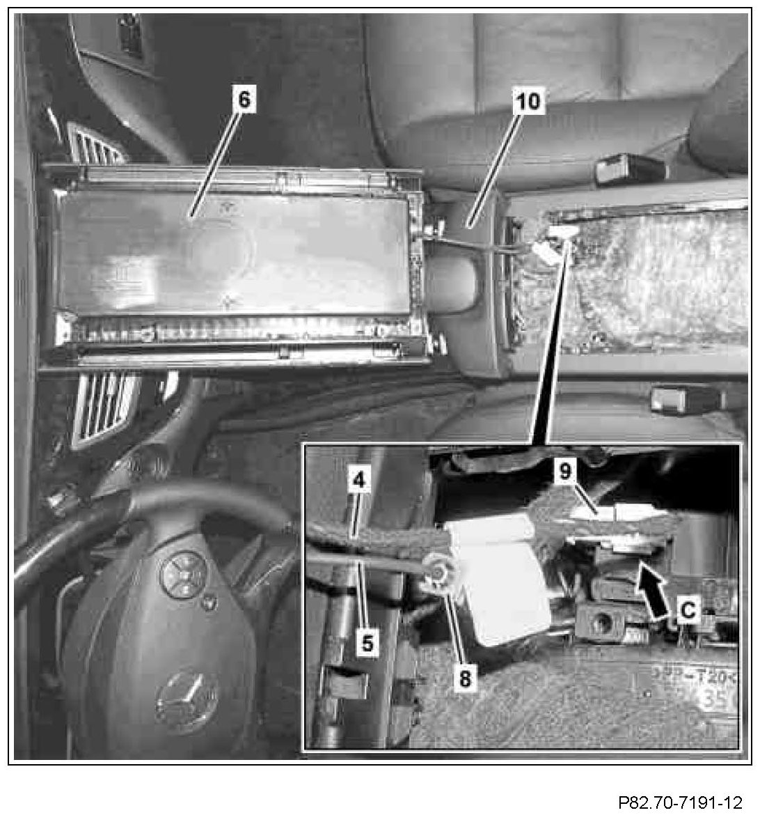 12 Clip connector with white 4-pin connector (9) into bracket (arrow C) on center console (10).
