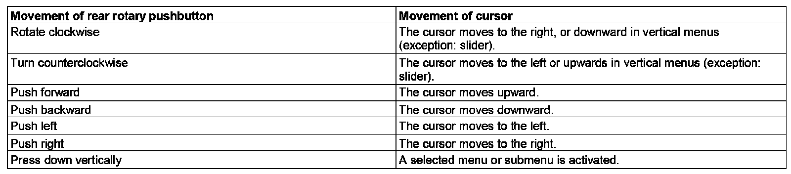 The low-resolution spacing (12 steps per revolution) is mainly used for selecting menus. The high-resolution spacing (32 steps per revolution) is used for selecting and moving within long lists. The rear rotary pushbutton is locked at the end of a selection list, i.e. it is not possible to turn the rear rotary pushbutton further clockwise when the bottom of a selection list is reached.