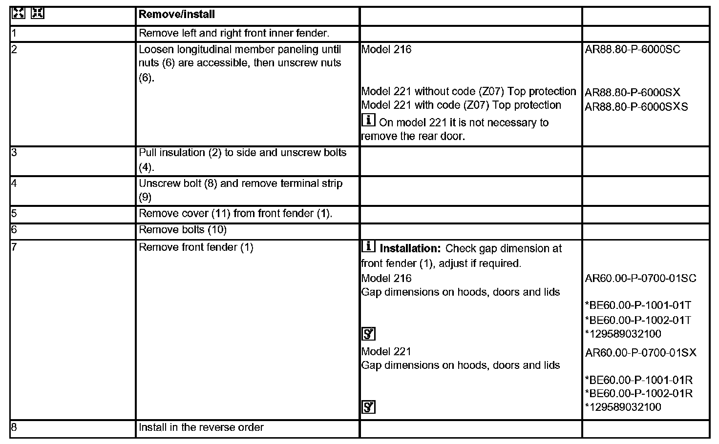 AR88.10-P-1000SX Remove/install Front Fenders