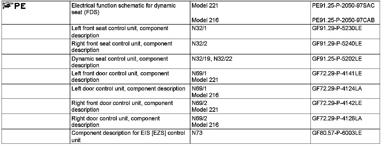 The status of the switches is read in via the front door LIN (LIN B1) by the left front door control unit (N69/1) (model 221) or the left door control unit (N69/1) (model 216) and then sent via the interior CAN to the left front seat control unit (N32/1). The left front seat control unit then transmits the command to store and adjust the corresponding position to the left front dynamic seat control unit.