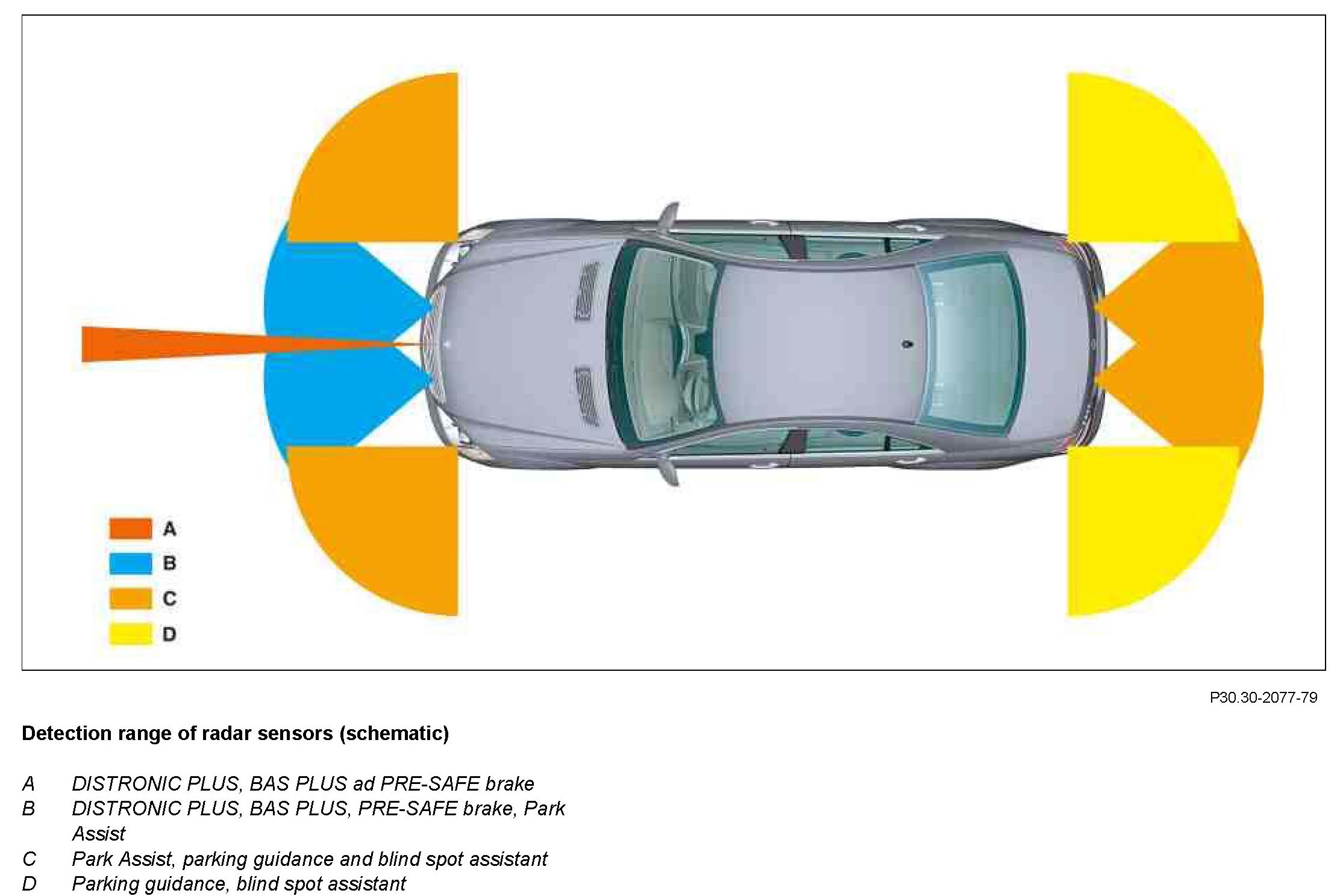 Short range sensors cover a wide area in front of and behind the vehicle. They are particularly suitable therefore in Distronic Plus mode for low vehicle speed such as parking assist and for blind spot monitoring.