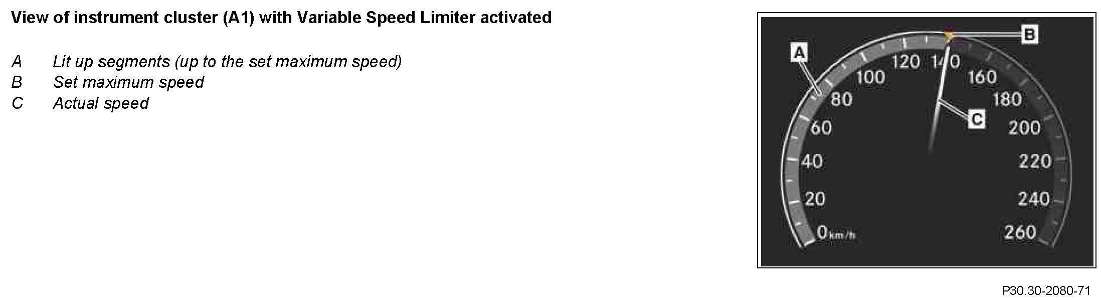 When the Variable Speed Limiter is activated, the segments in the electronic speedometer (A1p8) are illuminated from the beginning of the scale up to the set maximum speed. The set maximum speed is marked with an orange-colored triangle.