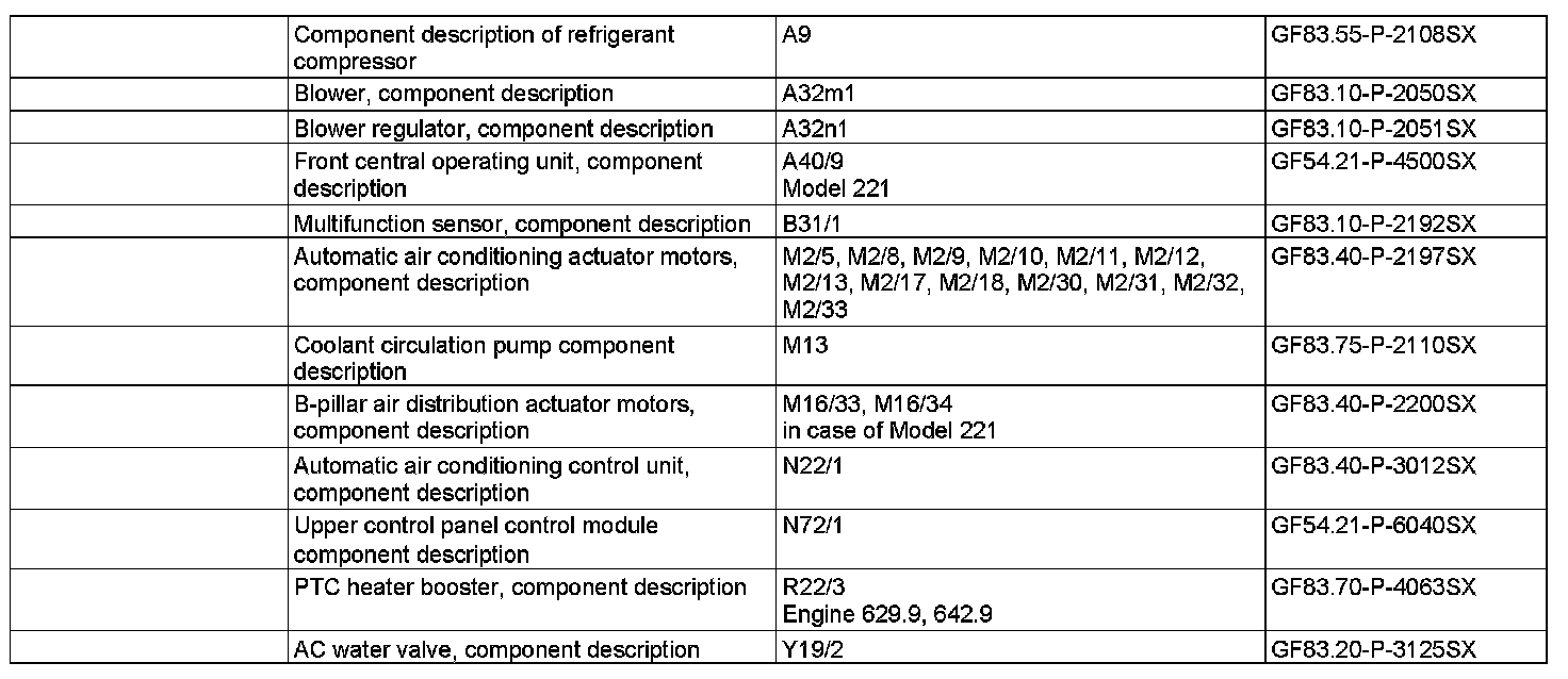 The defrosting function serves for keeping the windows free of fog or quickly defogging windows by actuating the defroster outlet flap to the full open position and closing the footwell flaps. Additionally, the refrigerant compressor (A9) is engaged. The fresh air/air recirculation flap is set to fresh air, the air conditioner water valve (Y19/2) is opened, and the coolant circulation pump (M13) and if necessary the PTC heater booster (R22/3) (with diesel engine) are actuated.