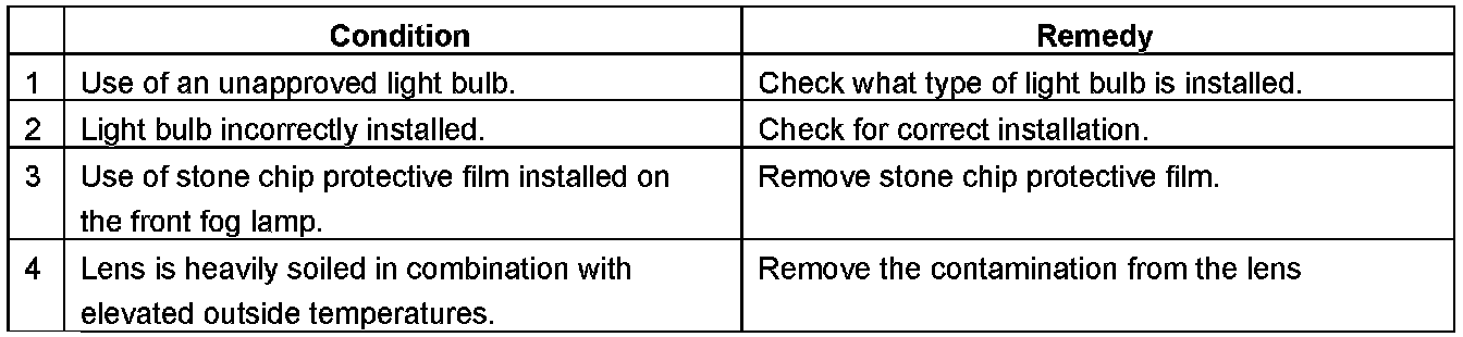 If you receive customer reports in the above model vehicles that the front fog lamp is deformed, refer to the below possible conditions / remedies.