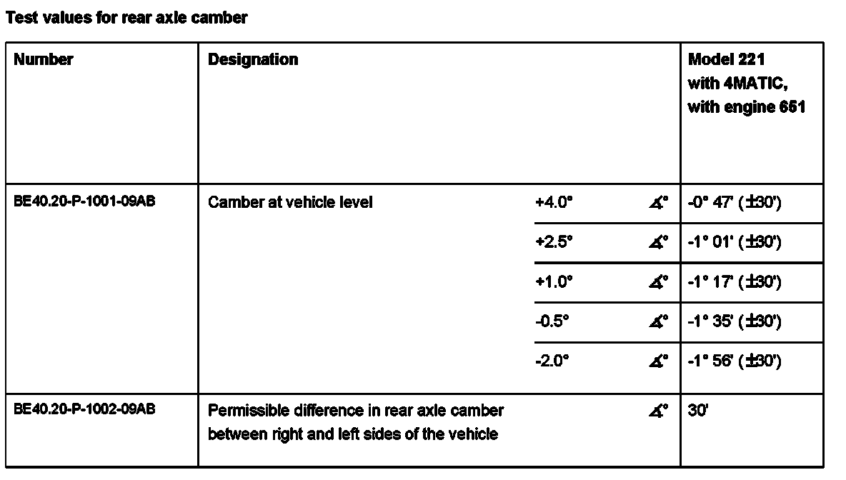 Test Values For Rear Axle Camber: