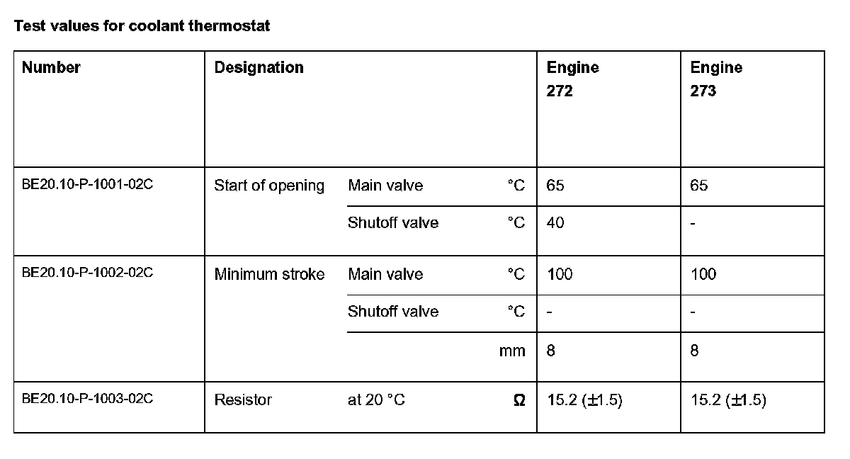 Test values for coolant thermostat: