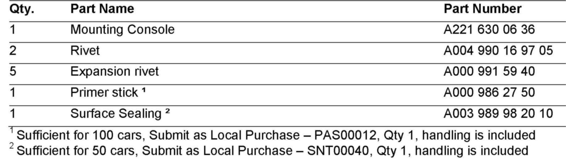 7. Align the new mount console (A221 630 06 36) with marks on the body from the old console location. Use a suitable marking devise (primer stick) to mark the location of the holes on the new mounting console, mark the hole locations through the two hole previously drilled in the body.