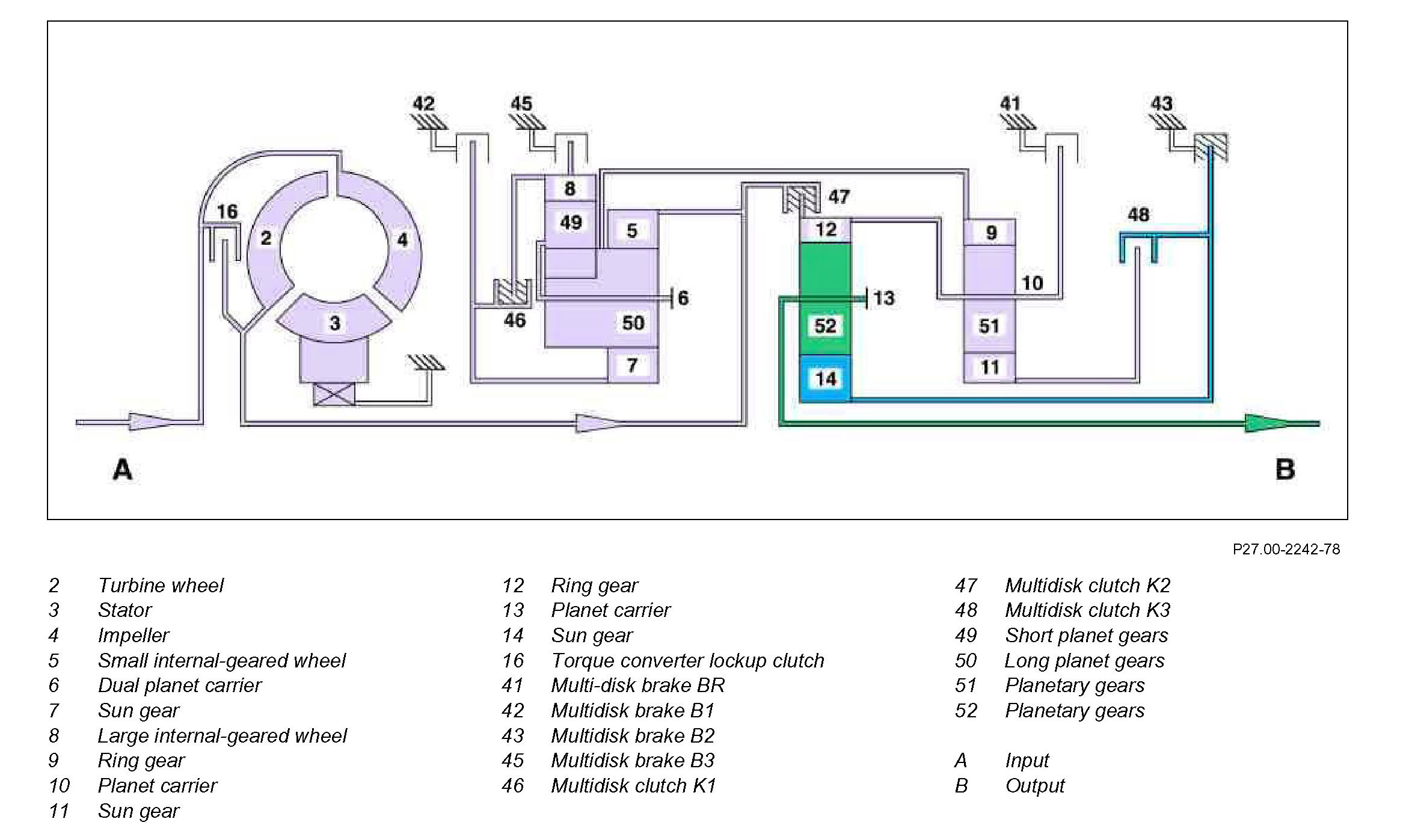 Due to the engaged multidisk clutch K2 the rotational speeds of ring gear (9) and ring gear (12) are the same. As a result the single rear planetary gear system is locked and not actively involved in the gear ratio.