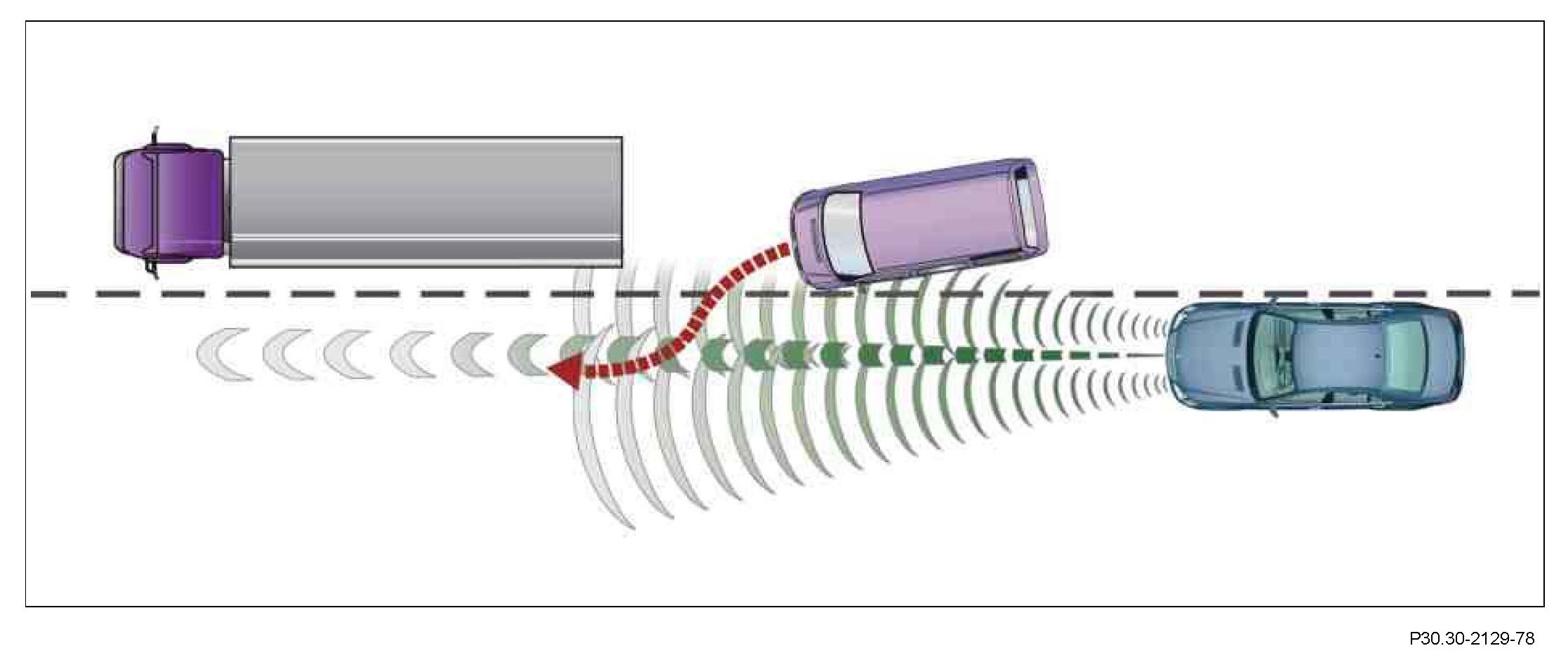^ If the preceding vehicle turns off and there is another vehicle in front, the system only switches over to the new target vehicle if it is moving. In the event that a stationary obstruction is encountered, an intermittent takeover tone and the DTR warning lamp warn the driver about the impending collision.