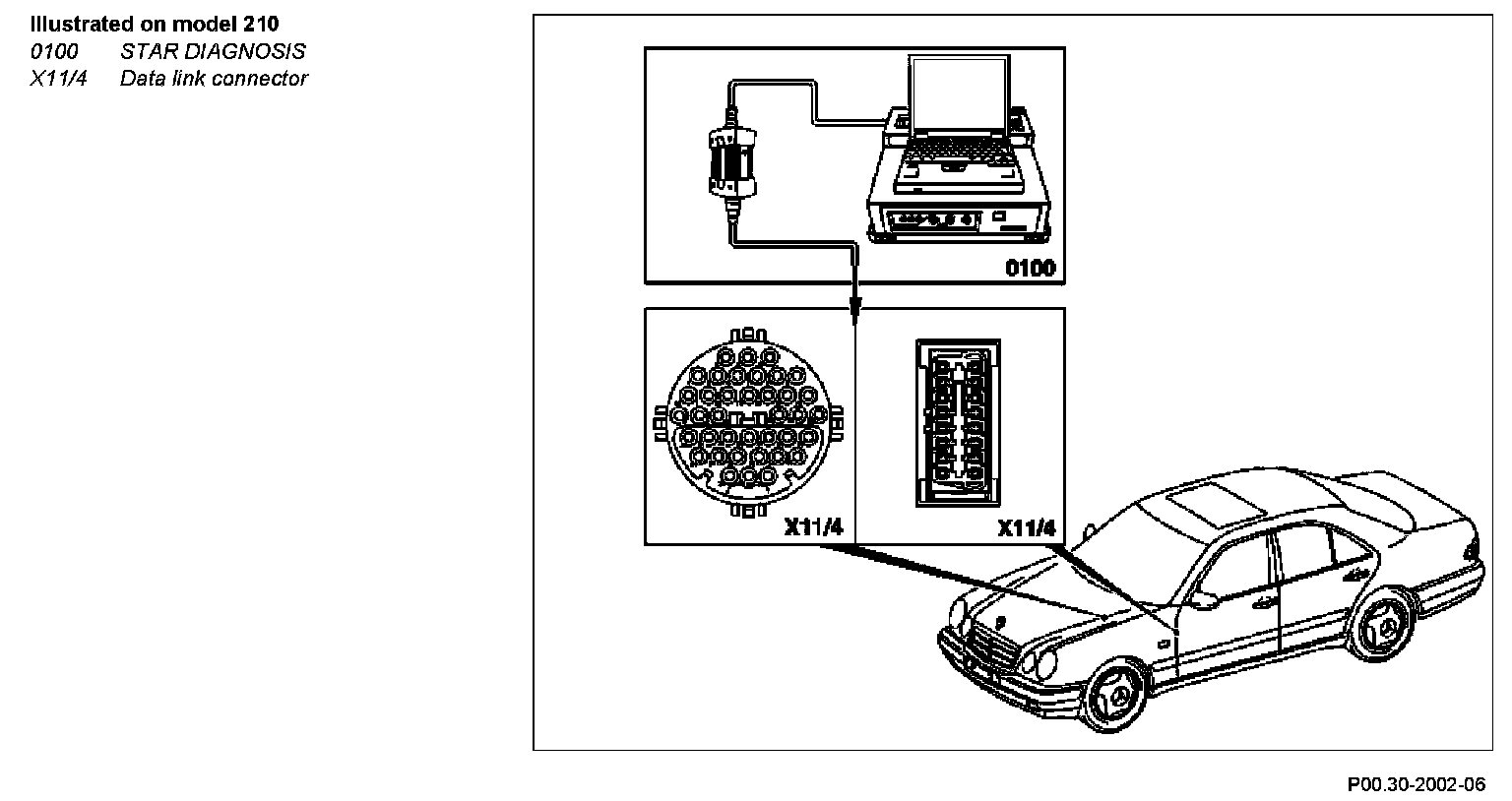 1 Connect STAR DIAGNOSIS (0100) to diagnostic socket, on the data link connector (X11/4) or on the data link connector (1.3) (X11/22).
