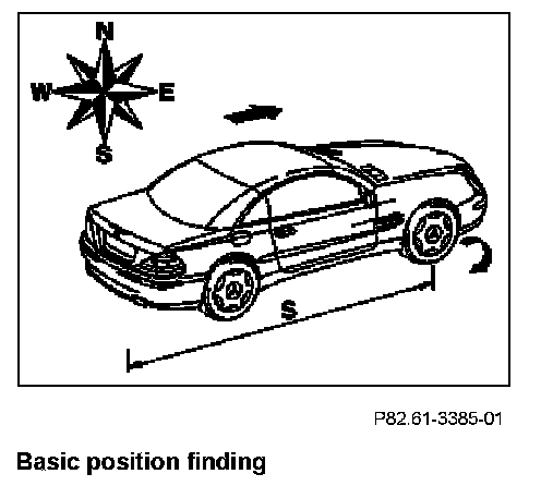 Continuous positioning finding means that the current position of the vehicle is calculated. It is active when the ignition is switched on and is carried out by the navigation processor (N41/1). During the switch-on phase (software is loaded), only the basic position finding is available. After switching the ignition off, all important positioning parameters are stored for the duration of the run-on time (approx. 30 min.).
