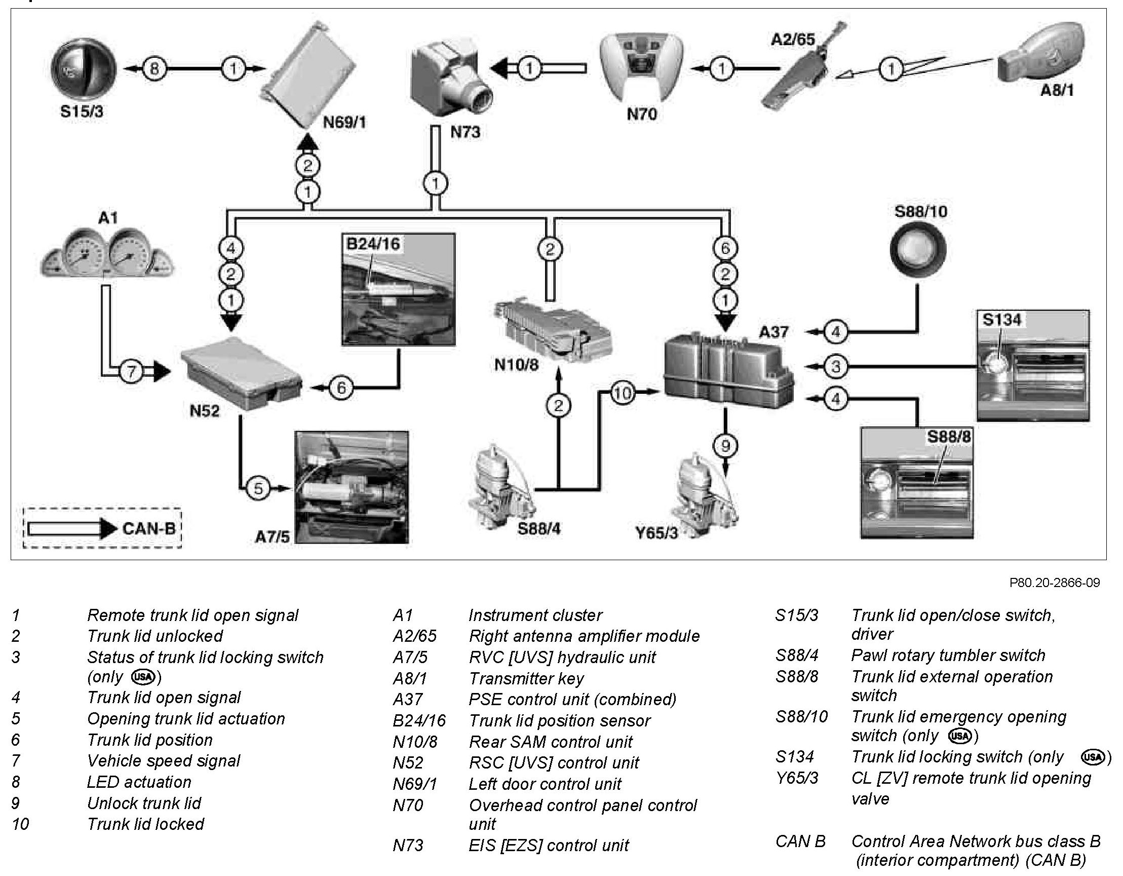 When the trunk lid emergency release switch is actuated and starts the opening procedure, the pneumatic control unit unlocks the trunk lid via the CL remote trunk lid opening valve.Unlocking is recognized by the rear SAM control unit via the pawl rotary tumbler switch. It transmits the signal "Trunk lid unlocked" to the RSC control unit and pneumatic control unit via CAN-B.