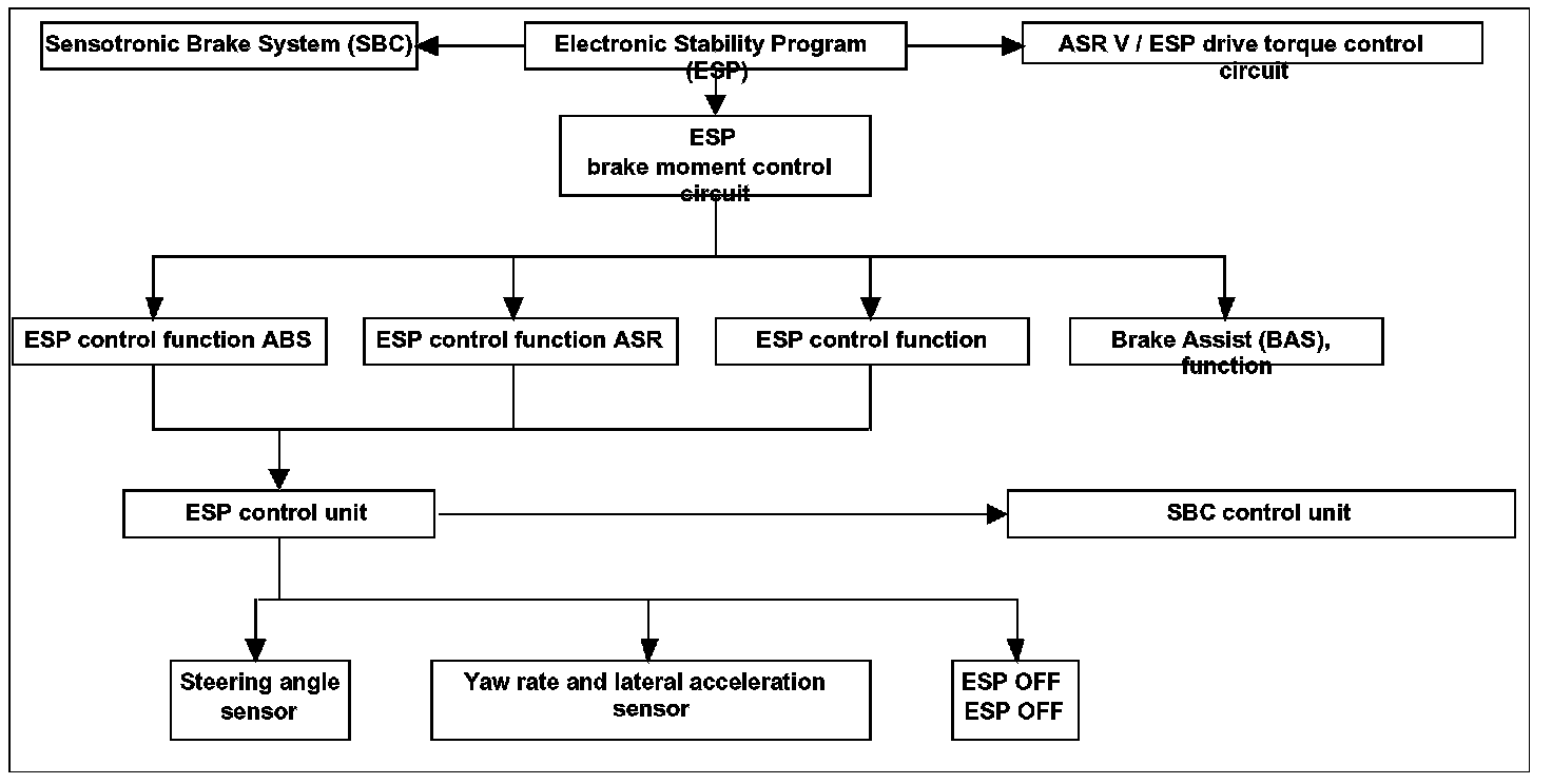 If over steering or under steering is detected, a calculated brake intervention at the front or rear axle is carried out via the ESP control unit and the SBC hydraulic unit. This braking action deliberately counteracts the undesirable vehicle motion.