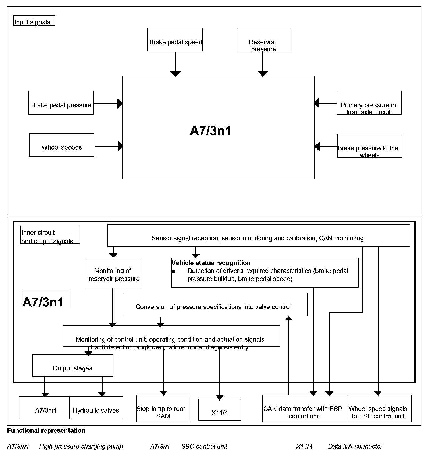The wheel pressure signals of all 4 wheels, the stop lamp switch signal (S9/1), the front axle pre-pressure signal, the storage pressure and pedal travel are passed on for further processing to the ESP, SPS [PML] and BAS control unit (N47-5) via the CAN SBC.