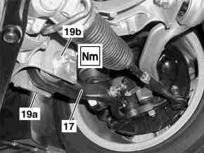 The repair bolt (19c) must not be turned after the torque strut or spring control arm has been fixed in the bearing. Do not tighten the nut yet so that the rubber mounts on the torque strut and spring control arm can turn when the suspension is compressed and rebounded.
