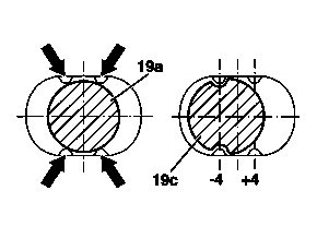 The standard bolt (19a) is centered by the bumps (arrows) in the bearing of the torque strut or spring control arm. Grooves in the repair bolt (19c) permit it to be installed in the bearing on either the right or left side, allowing the torque strut or spring control arm to be adjusted by a distance of 4 mm to the inside or outside.