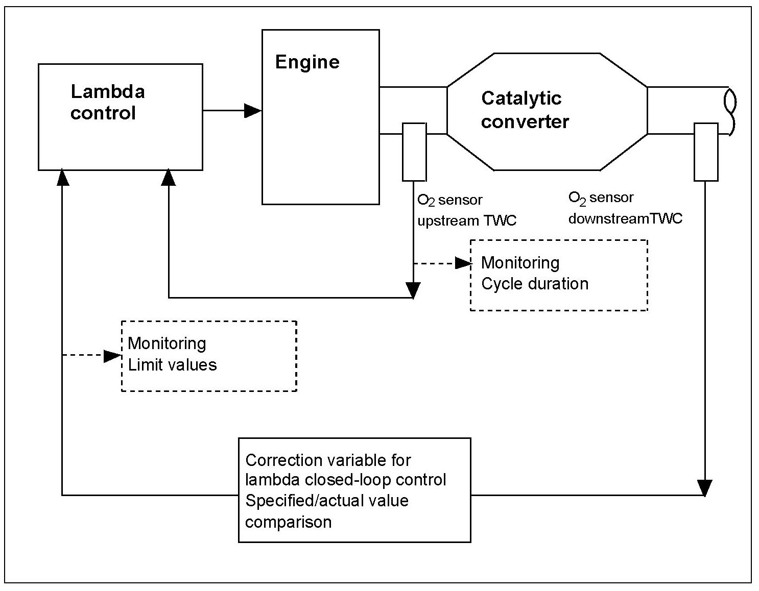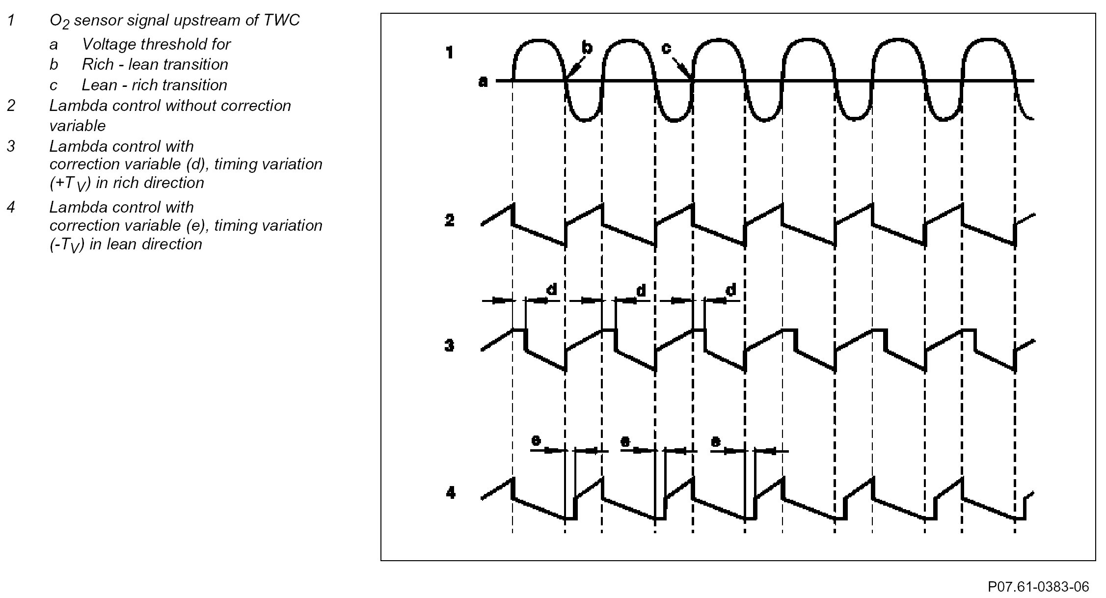 The ME engine control unit determines the lambda mean value from signals from the O2 sensors downstream of TWC. This value is compared with a stored value for optimum exhaust emissions. If the deviation is too large after a number of measurements, a correction variable (time delay ± TV ) is determined for the lambda control.