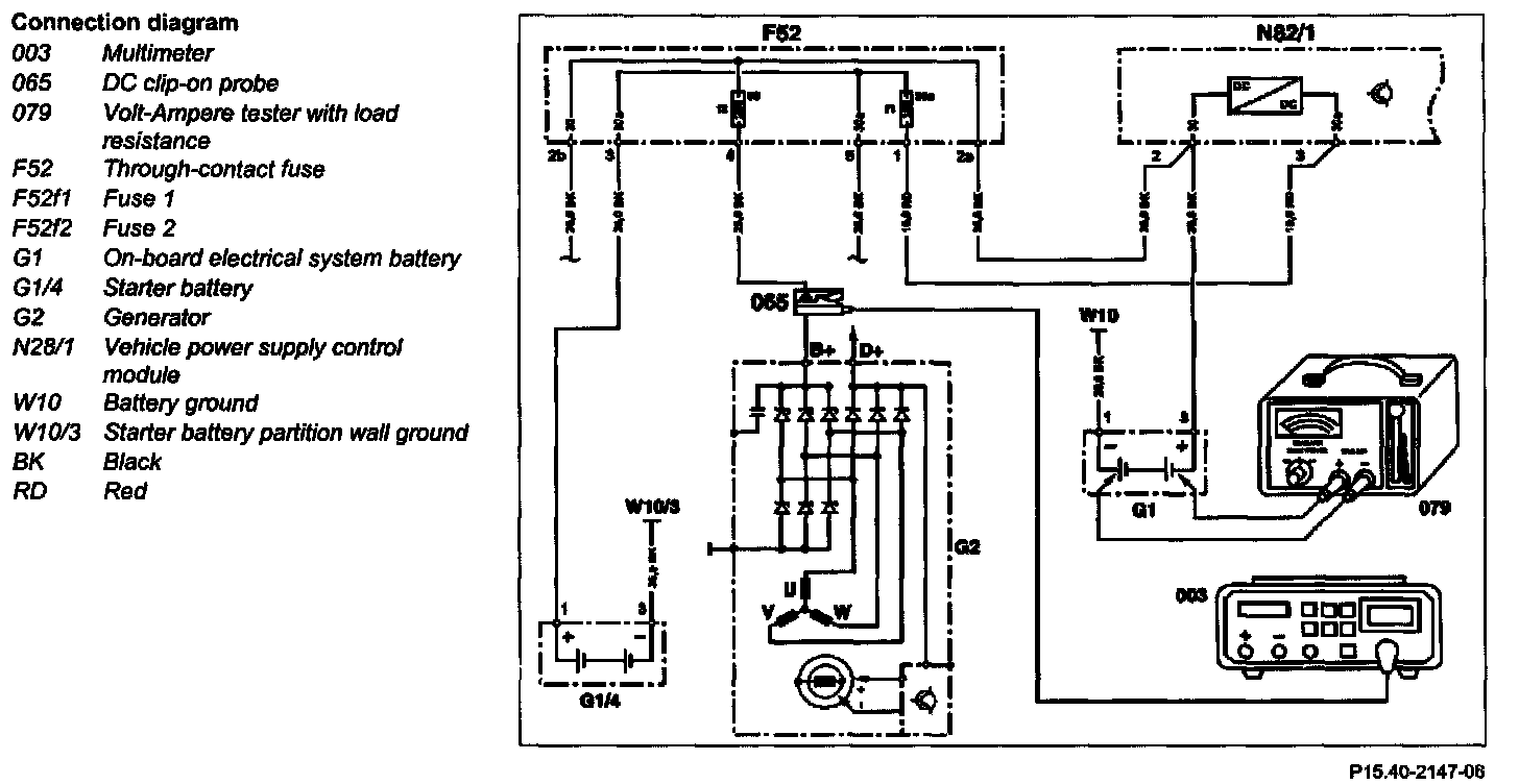 7 Test the charging current at a higher engine speed (about 2500 1/min.), so that the on-board electrical system battery (G1) is loaded with the Volt-Ampere tester and load resistance (079)